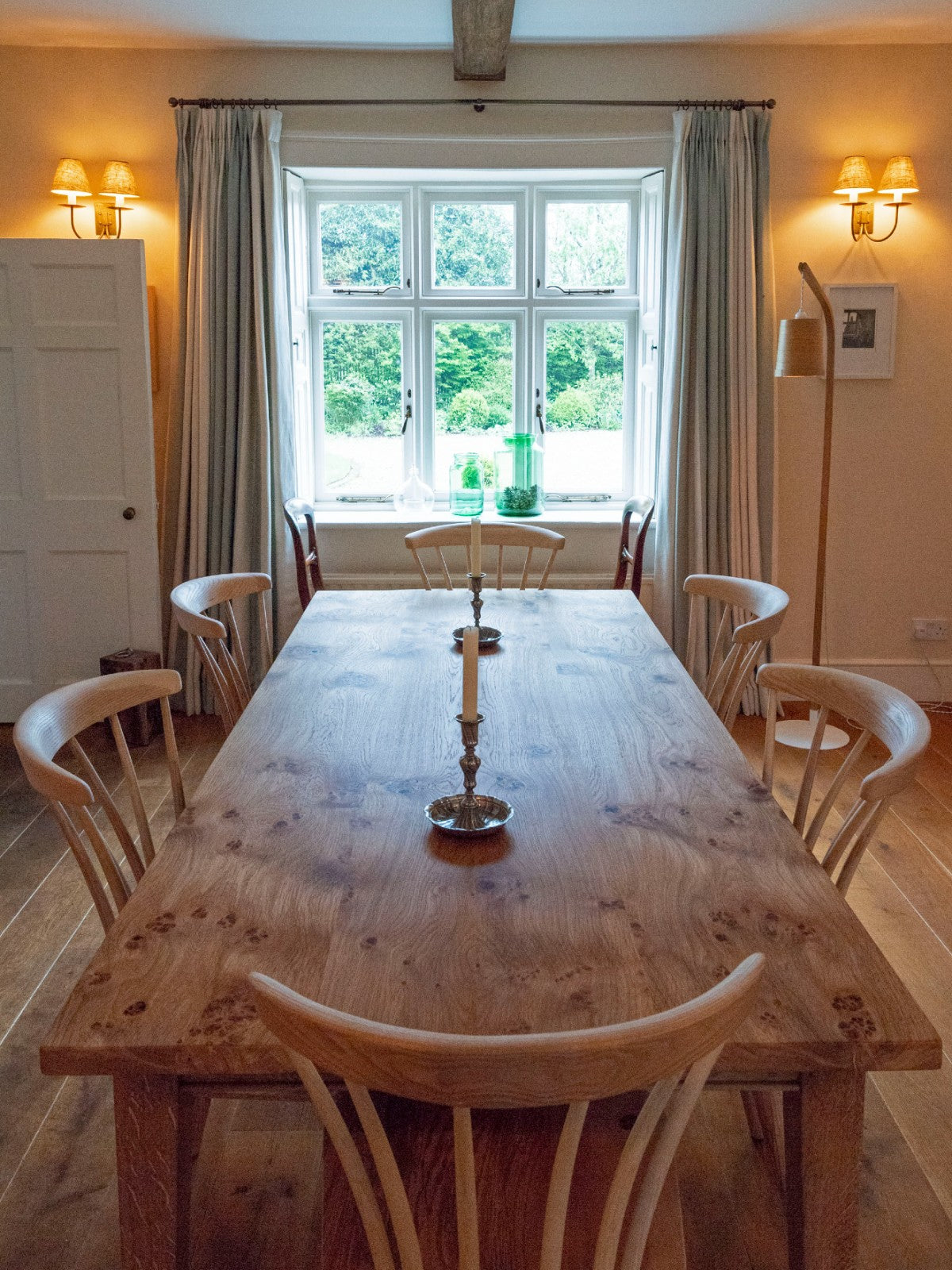 Tom is an excellent craftsman, our table is a work of art and is way beyond our high expectations. The carefully selected pippy oak is just gorgeous. The table completed with 8 stunning chairs.